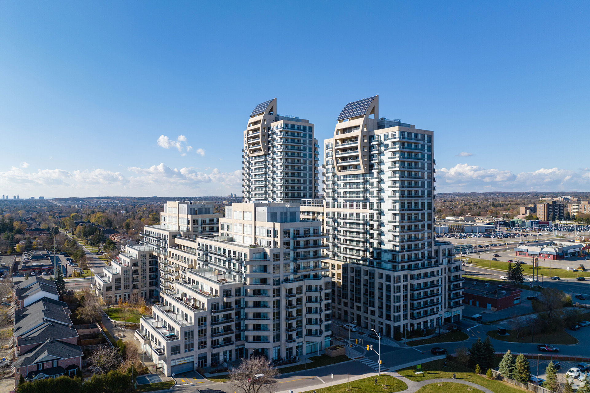 This dual 30 kW AC array in Richmond Hill, ON powers public loads for a residential condo tower, enabling the board to plan for long-term savings and to invest in sustainability. Our crews rappelled down the towers to install panels at heights of nearly 300 ft.